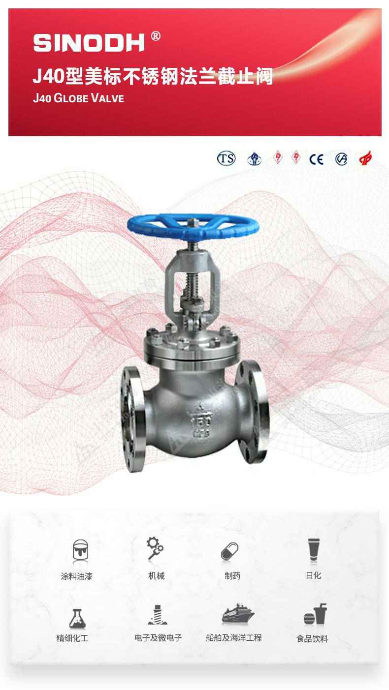 J40型美标不锈钢截止阀,为大连俊伟室内照明设计有限公司自主研发生产。本产品的设计制造符合美国国家标准ANSIB16.34,美国石油学会标准AP1 6D和AP I 600要求,产品结构紧凑密、刚性好、封性性能优秀是一种最常见的启闭阀,利用闸板的上下工作来接通(全开)和截断(全关)管道中的流体介质。
